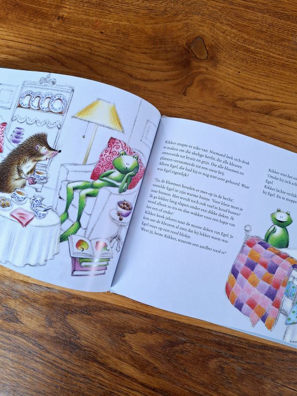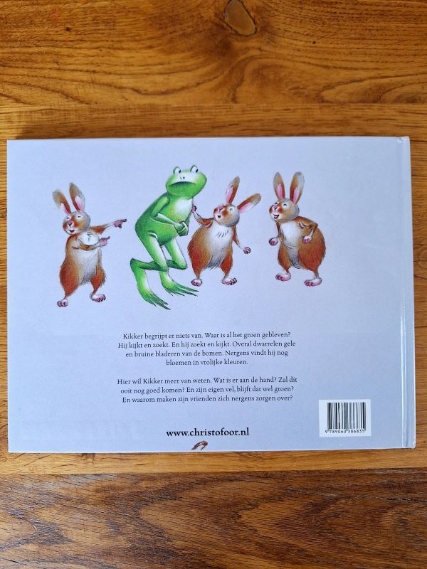 Dit tweedehands boek gaat over Kikker. Hij begrijpt er niks van, waar is al het groen gebleven? Hij kijkt en zoekt. En hij zoekt en kijkt. Overal dwarrelen gele en bruine bladeren van de bomen. Nergens vindt hij nog bloemen in vrolijke kleuren. Hier wil kikker meer van weten. Wat is er aan de hand? Zal dit ooit nog goed komen?