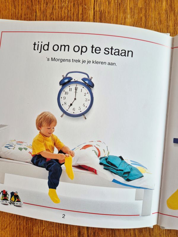 Een stukje nostalgie! Dit boek is voor jonge kinderen om het begrip tijd te leren. Met kleurenfoto’s van vertrouwde voorwerpen wordt de dagelijkse volgorde van gebeurtenissen (opstaan, ontbijten etc.) gevisualiseerd.