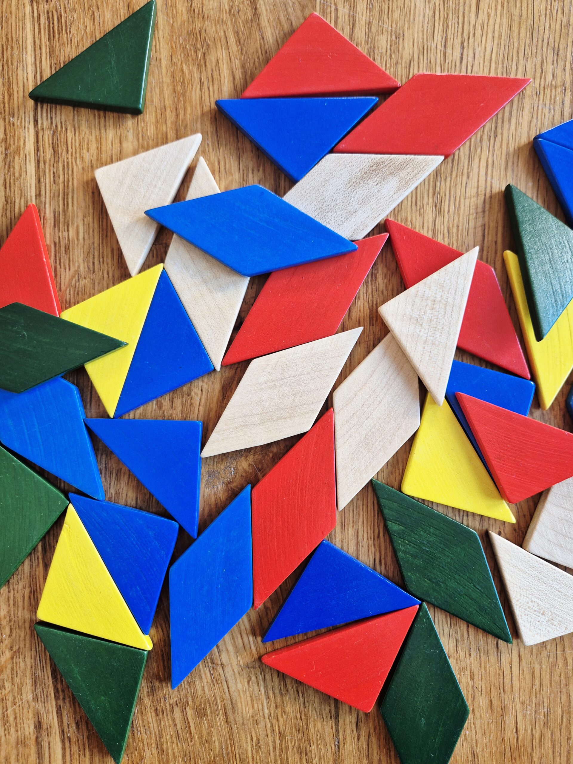 Maak met deze tweedehands houten vormpjes de mooiste figuren. De 40 mozaïekstukjes worden geleverd in een handig linnen opbergzakje.