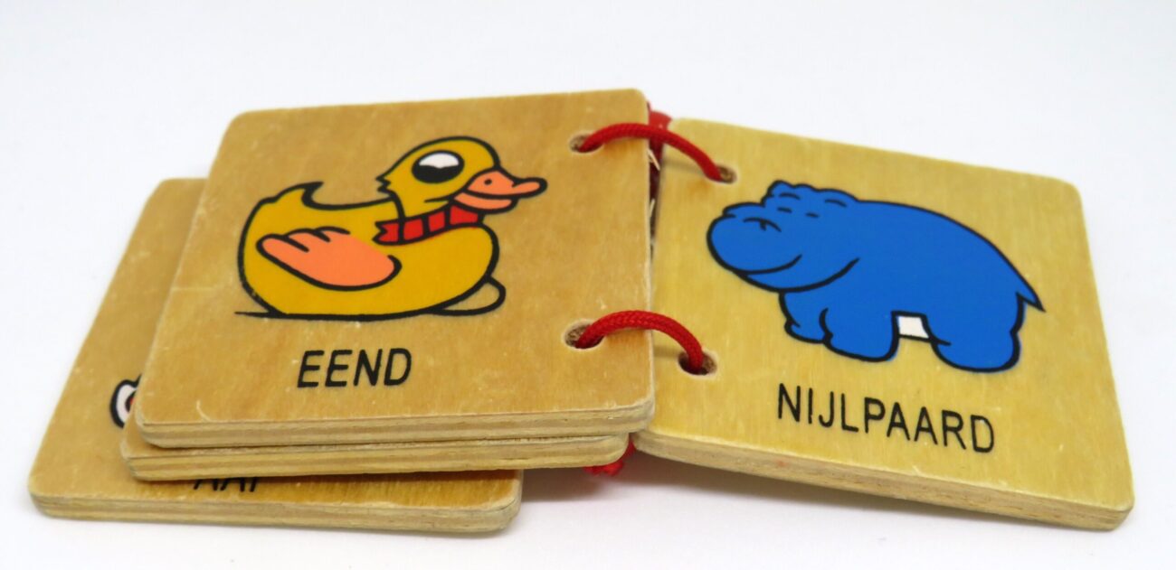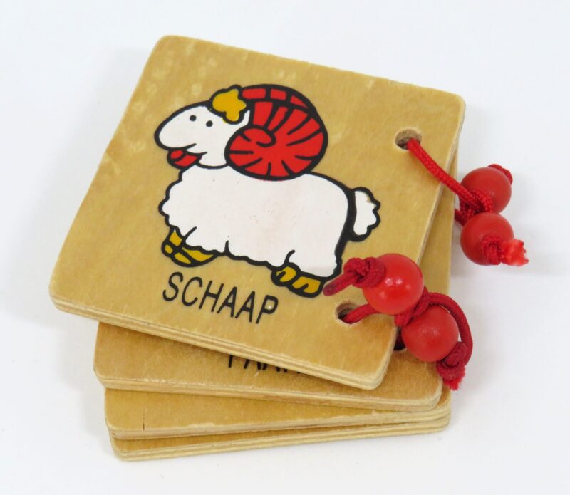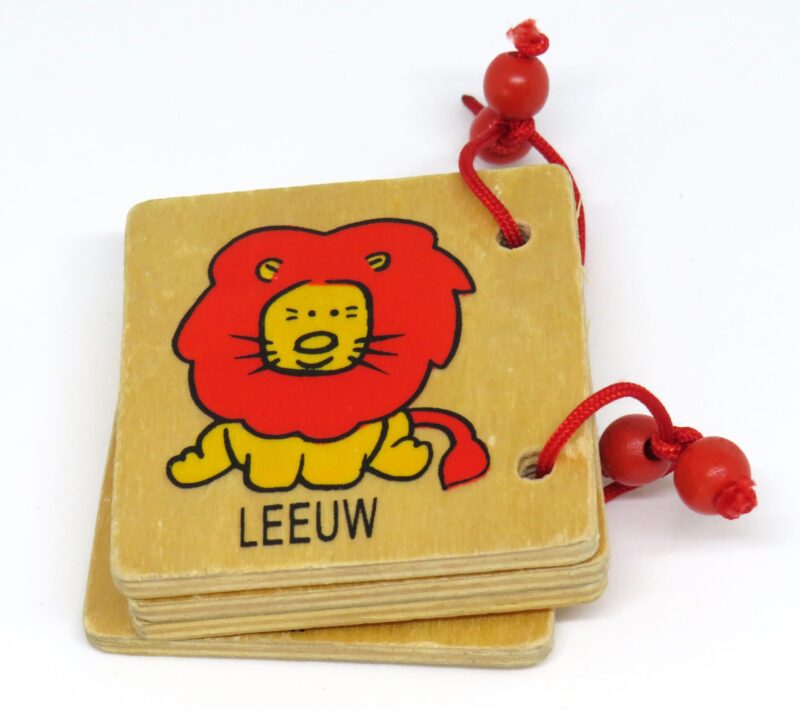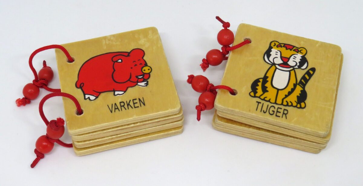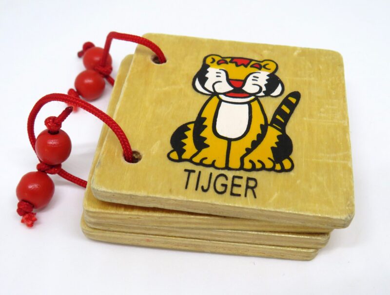 Twee tweedehands houten boekjes met in totaal 16 verschillende dieren. Leuk voor de kleintjes om lekker doorheen te bladeren en te oefenen met hun woordenschat.