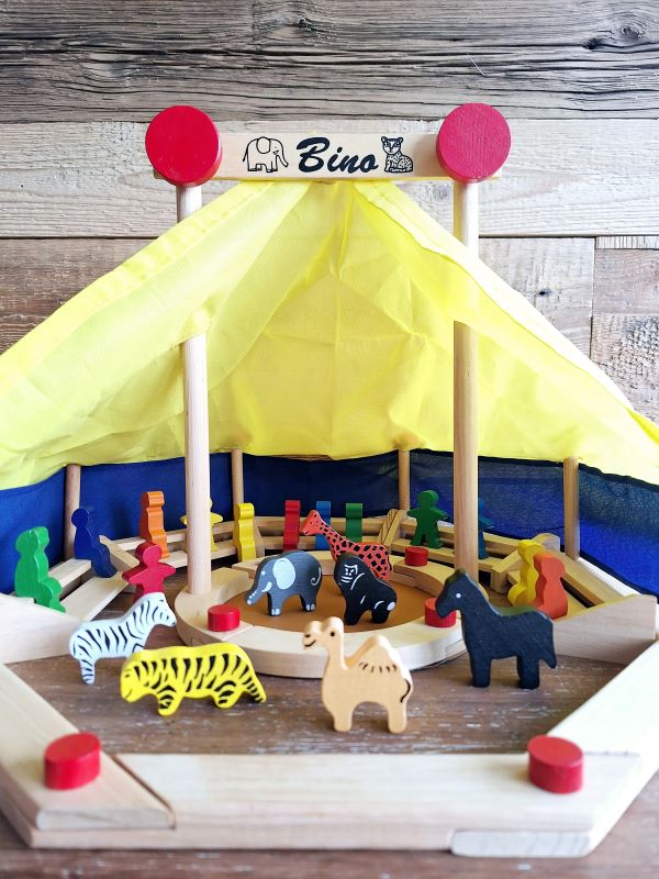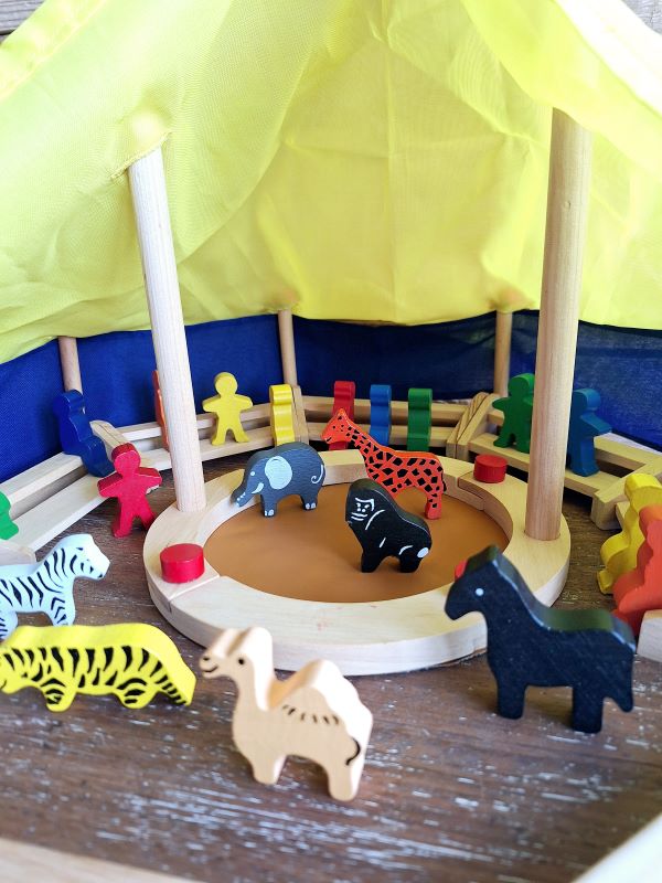 Bouw jouw eigen circus! Deze tweedehands set bestaat uit een houten constructie, tentdoek van stof, tribunes, 13 houten figuren en 7 houten dieren. Er ontbreekt alleen één rood pinnetje, maar het bouwwerk blijft bewoon staan.