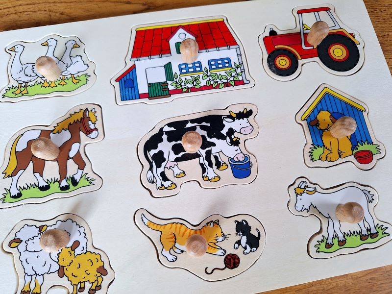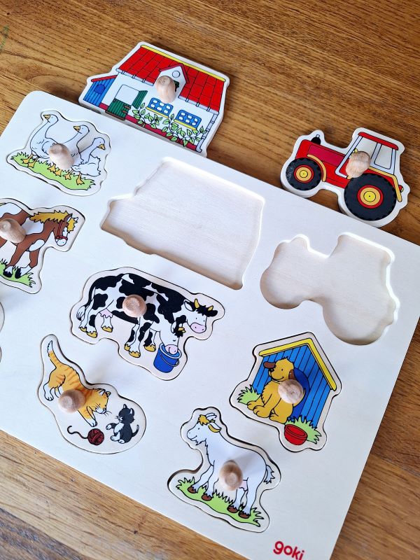 Tweedehands houten puzzel met het thema boerderij van het merk Goki.