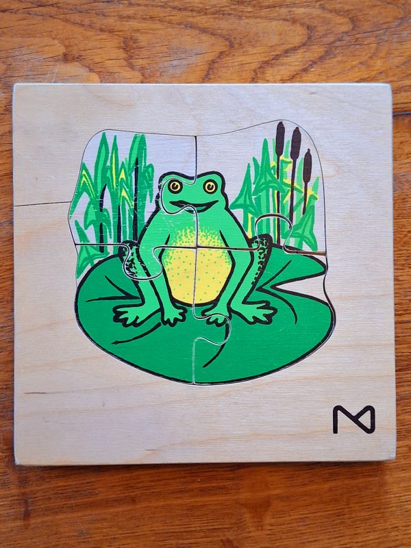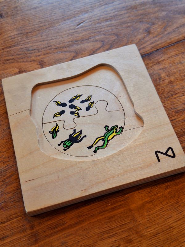 Hoe gaaf is deze tweedehands houten puzzel van de levenscyclus van een kikker! De puzzel bestaat uit drie lagen, van kikkerdril tot kikker. Leuk educatief speelgoed!