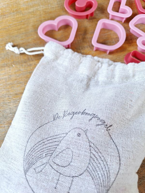 Een complete set bestaat uit 35 stuks: de letters van het alfabet, de cijfers 1 t/m 9 en vier verschillende symbolen. De 1/I, 6/9, N/Z en M/W worden dubbel gebruikt. De tweedehands uitsteekvormpjes worden geleverd in een handige linnen opbergzak.