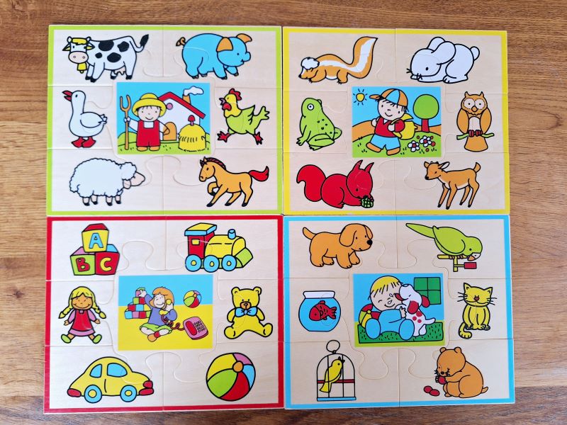 Handige tweedehands puzzel 4-in-1. In de houten doos zitten vier verschillende houten puzzels van 7 stukken met de thema’s boerderijdieren, bosdieren, speelgoed en huisdieren.
