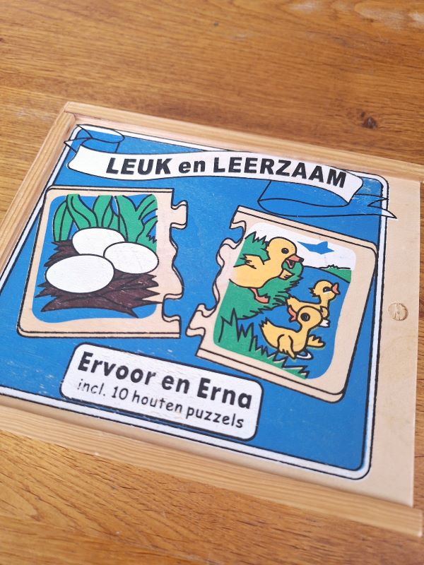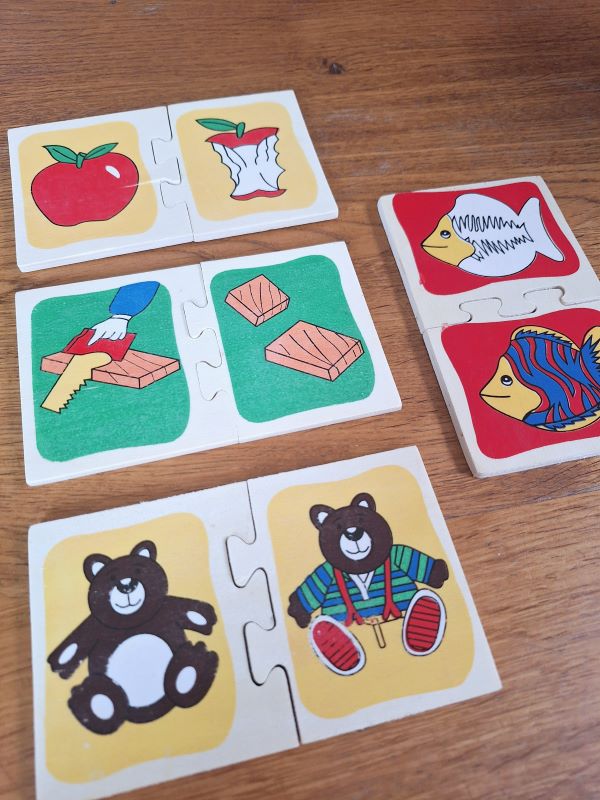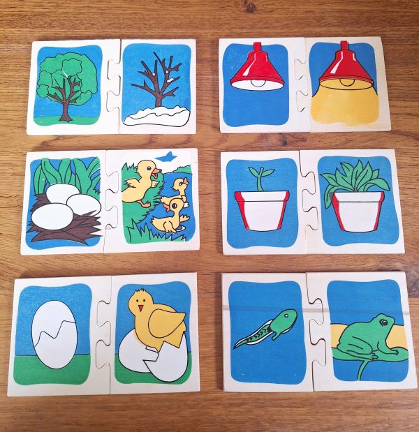 Tweedehands houten puzzel die bestaat uit 10 verschillende puzzels met ervoor en erna. Bijvoorbeeld een boom met bladeren vs. een boom zonder bladeren of licht uit vs. licht aan. Zowel leuk als leerzaam.