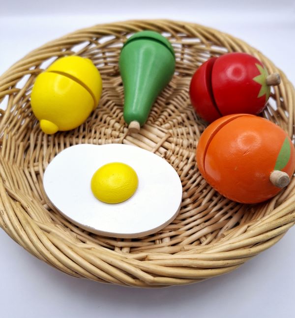 Nog op zoek naar houten eten voor in de speelkeuken? Deze tweedehands set bestaat uit een gebakken ei, citroen, peer, tomaat en een mandarijn.