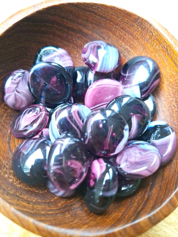 Glassteentjes zijn erg leuk voor in de speelbak of als loose parts, maar zijn zonde om nieuw te kopen want je kunt ze ook makkelijk tweedehands scoren. Deze set bestaat 60 paarse glassteentjes (bij sommige gemengd met wit) en de steentjes zitten in een mooi preloved glazen opbergpotje.
