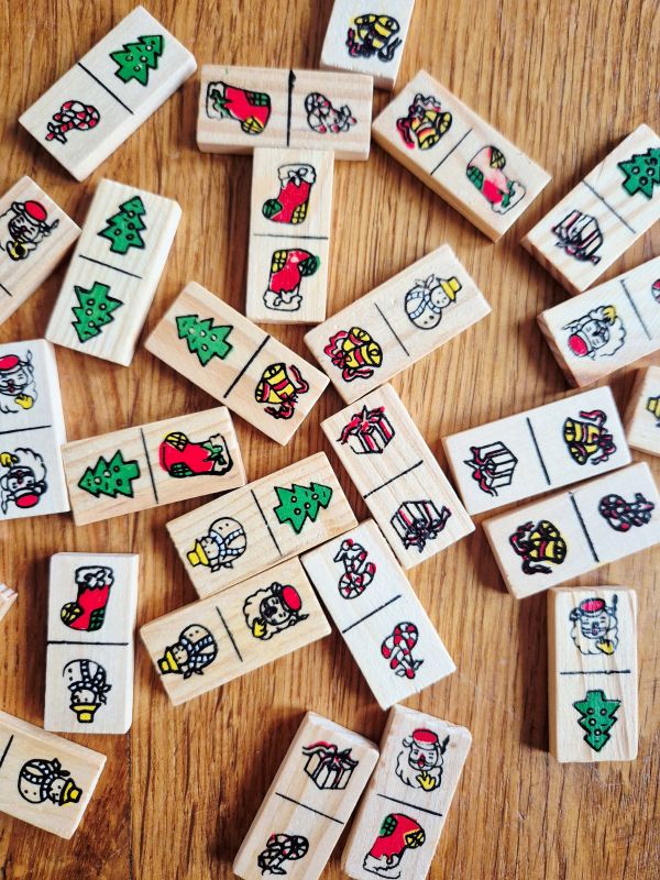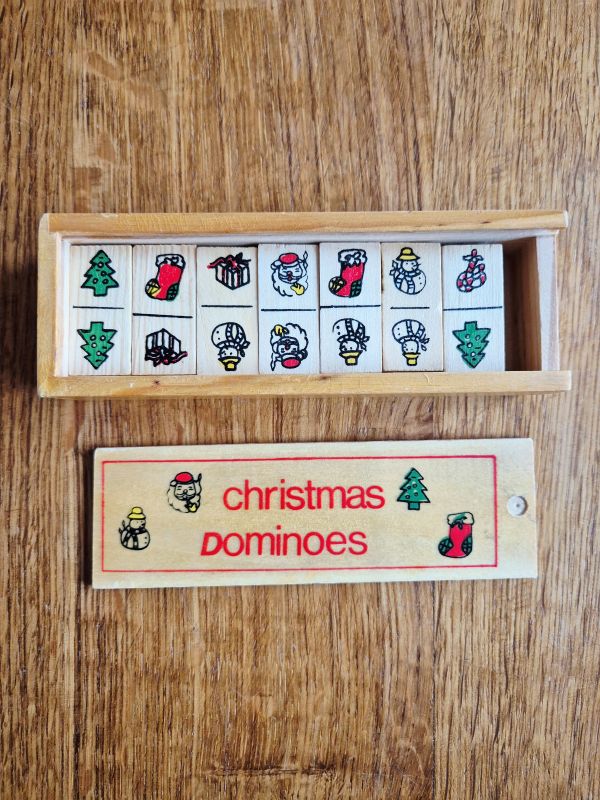 Tweedehands dominospel met 28 dominostenen met het thema kerst. De houten dominostenen zijn 2 cm x 4 cm en het houten opbergdoosje 15 x 5,3 x 3,3 cm, dus ideaal om ergens mee naartoe te nemen en daar te spelen.