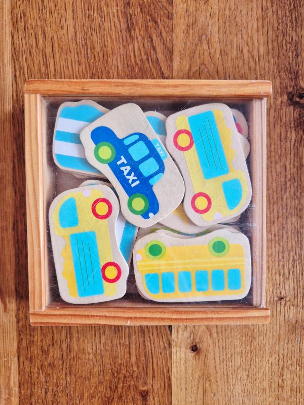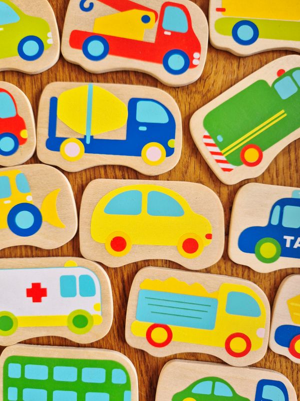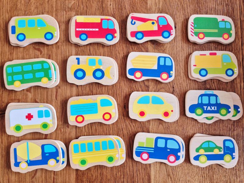 Houten memory spel met verschillende voertuigen. Draai de kaartjes om met de afbeeldingen naar beneden en zoek twee dezelfde plaatjes. Weet jij nog waar de taxi ligt? De persoon met de meeste dubbele kaartjes wint!