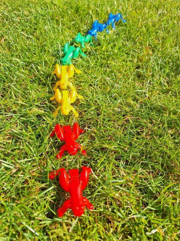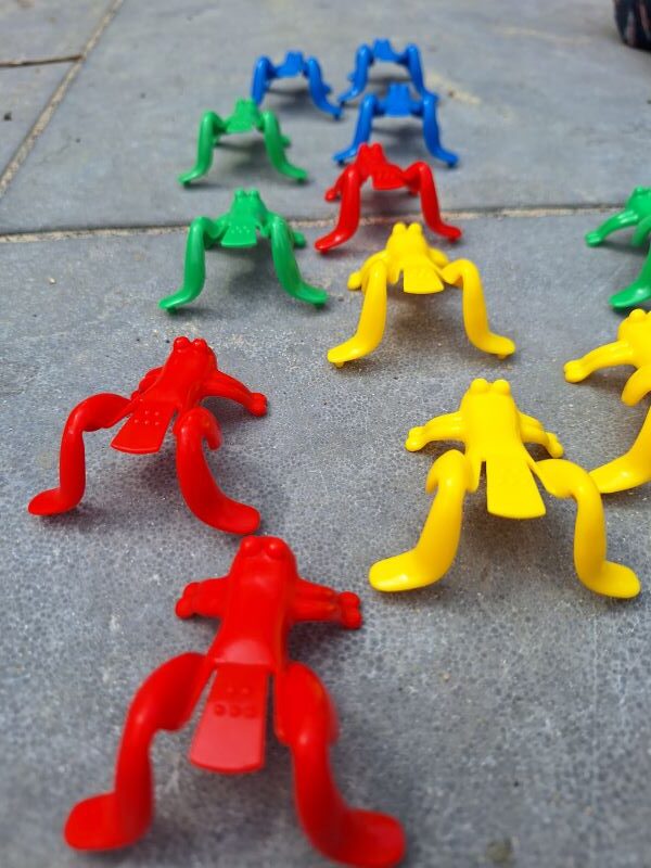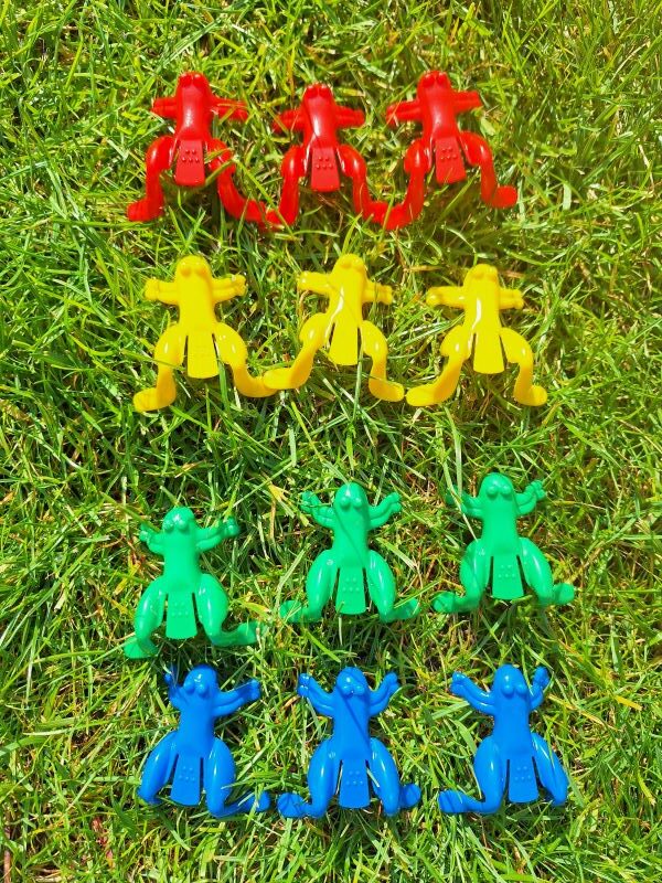 Ken je het spelletje van vroeger met de springende kikkers? Bij dit tweedehands spelletje worden sprinkhanen gebruikt i.p.v. kikkers. Wie heeft zijn/haar sprinkhanen als eerste allemaal in het bakje?