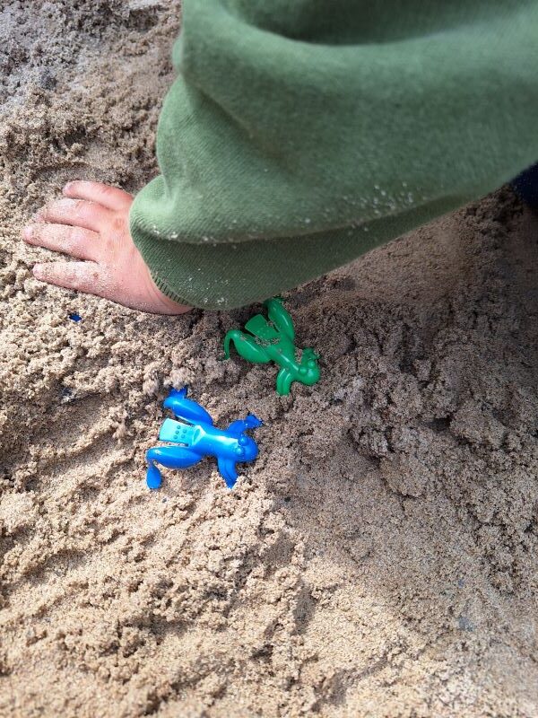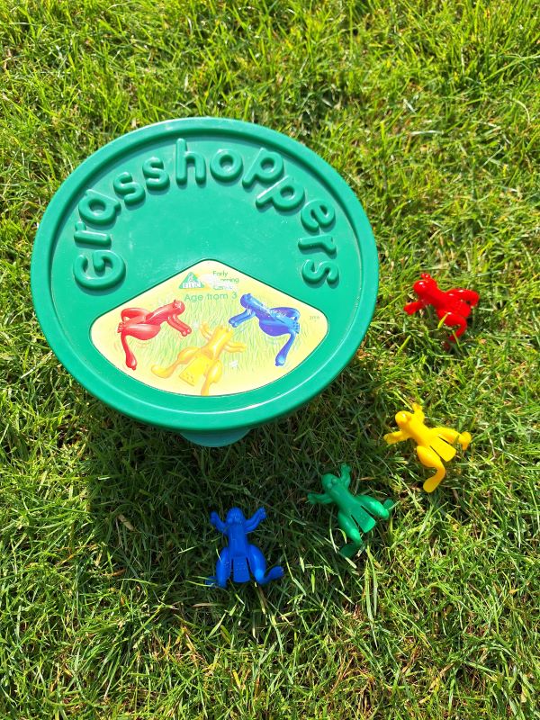Dit spel van het merk ELC (Early Learning Centre) bestaat uit een opbergdoos inclusief 12 sprinkhanen (vier verschillende kleuren).